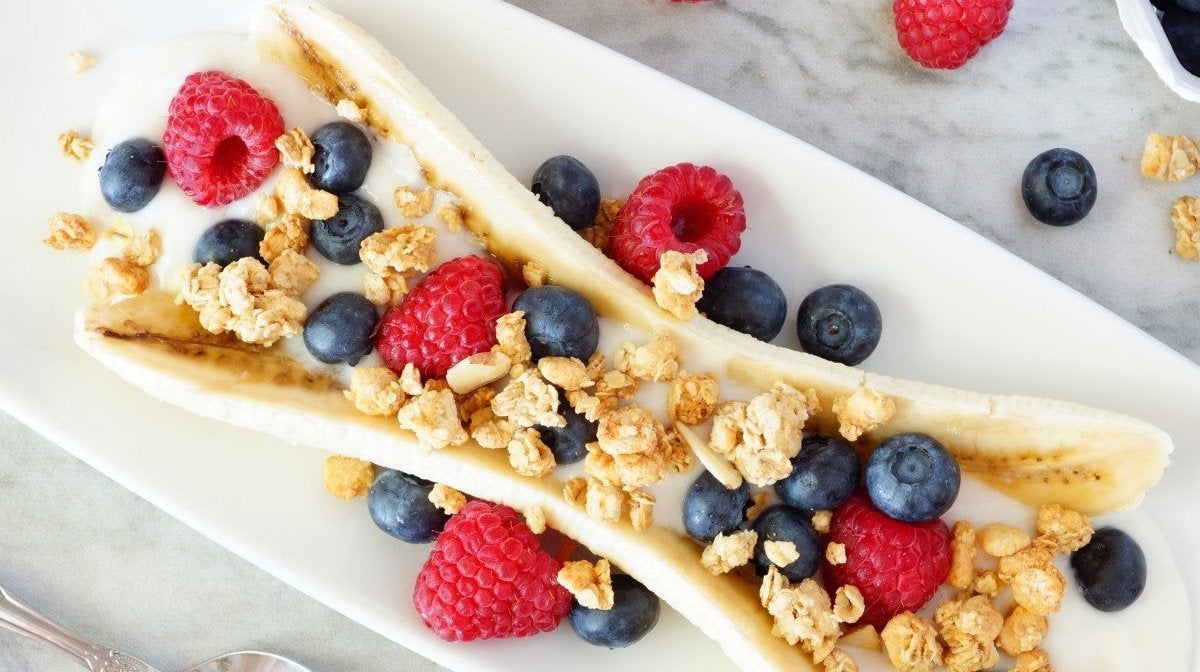 Απλά κόψε την μπανάνα εγκάρσια και γέμισέ την με στραγγιστό γιαούρτι, φρέσκα φρούτα και ξηρούς καρπούς!