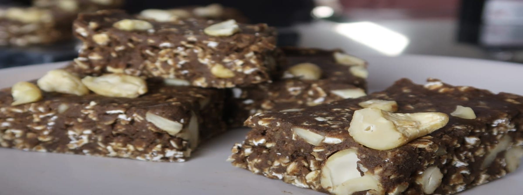Οι μη-ψημένες χορτοφαγικές μπάρες πρωτεΐνης είναι επίσης απαλλαγμένες από όλα τα προστιθέμενα σάκχαρα, με τη γλυκύτητα τους να προέρχεται από τους χουρμάδες και τη σοκολατένια γεύση μερικών κουταλιών σκόνης από κακάο. Η βρώμη είναι μια εξαιρετική πηγή υδατανθράκων χαμηλού γλυκαιμικού δείκτη, που σημαίνει μια αργή απελευθέρωση ενέργειας ώστε να σας κρατήσει για μεγαλύτερο χρονικό διάστημα. Θα αισθάνεστε πιο γεμάτοι για πολύ περισσότερο χρόνο, καθώς επίσης θα πάρετε και μερικά καλά λιπαρά και επιπλέον πρωτεΐνη από τα κάσιους.