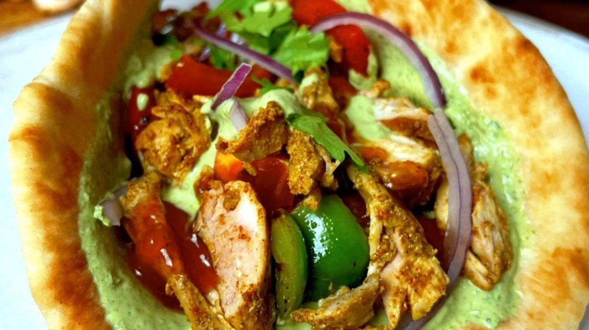 - Κόψε τα μπούτια κοτόπουλου σε λεπτές λωρίδες. Βεβαιώσου ότι οι υπόλοιπες γαρνιτούρες σου είναι έτοιμες για σερβίρισμα και στη συνέχεια φτιάξε τους γύρους σου. Πρώτα, πρόσθεσε μια γενναιόδωρη ποσότητα σάλτσας μέντας-γιαουρτιού στη βάση της πίτας σου, στη συνέχεια βάλε τα όλα μαζί, το κοτόπουλο, την πιπεριά, τις φέτες κόκκινου κρεμμυδιού και τις ντομάτες. Από πάνω βάλε τσάτνεϊ μάνγκο και κόλιανδρο — στη συνέχεια, μπορείς να καταβροχθίσεις ένα πραγματικά επικό σπιτικό γεύμα.