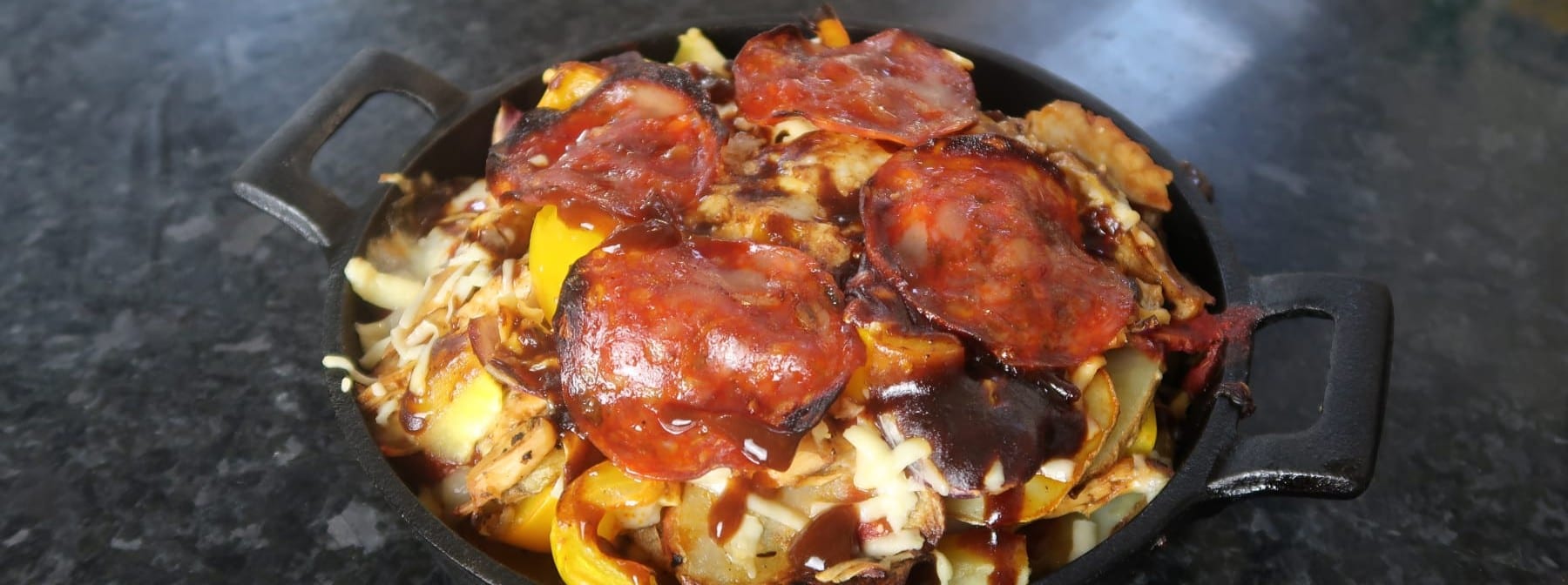• 2 πατάτες μετρίου μεγέθους – λεπτά κομμένες • 2 κουταλιές της σούπας ελαιόλαδο • 2 φιλέτα κοτόπουλο στήθος • Ρίγανη • BBQ Σάλτσα χωρίς ζάχαρη χαμηλών θερμίδων • 200g ντοματοπολτό • 1 μικρό κόκκινο κρεμμύδι – κομμένο • 1 πιπεριά – κομμένη • 50g άπαχο τσένταρ – τριμμένο • 50g άπαχη μοτσαρέλα – τριμμένη • 4 φέτες πεπερόνι