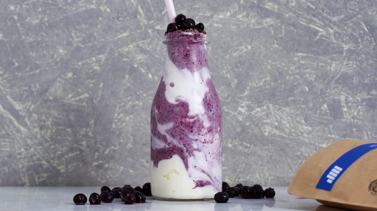 #1 Αρχικά, ανακατέψτε την πρωτεΐνη μπιζελιού, τα μύρτιλα και το γάλα μέχρι να μαλακώσουν και στην συνέχεια ρίξτε στο ποτήρι μέχρι την μέση.