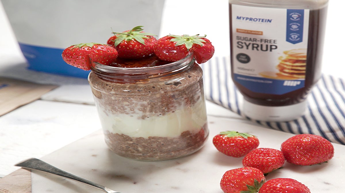 Σε ενα βάζο ή μεγάλο ποτήρι προσθέστε την βρώμη , τους σπόρους Chia και την σκόνη με Ζεστή Σοκολάτα Πρωτεΐνης